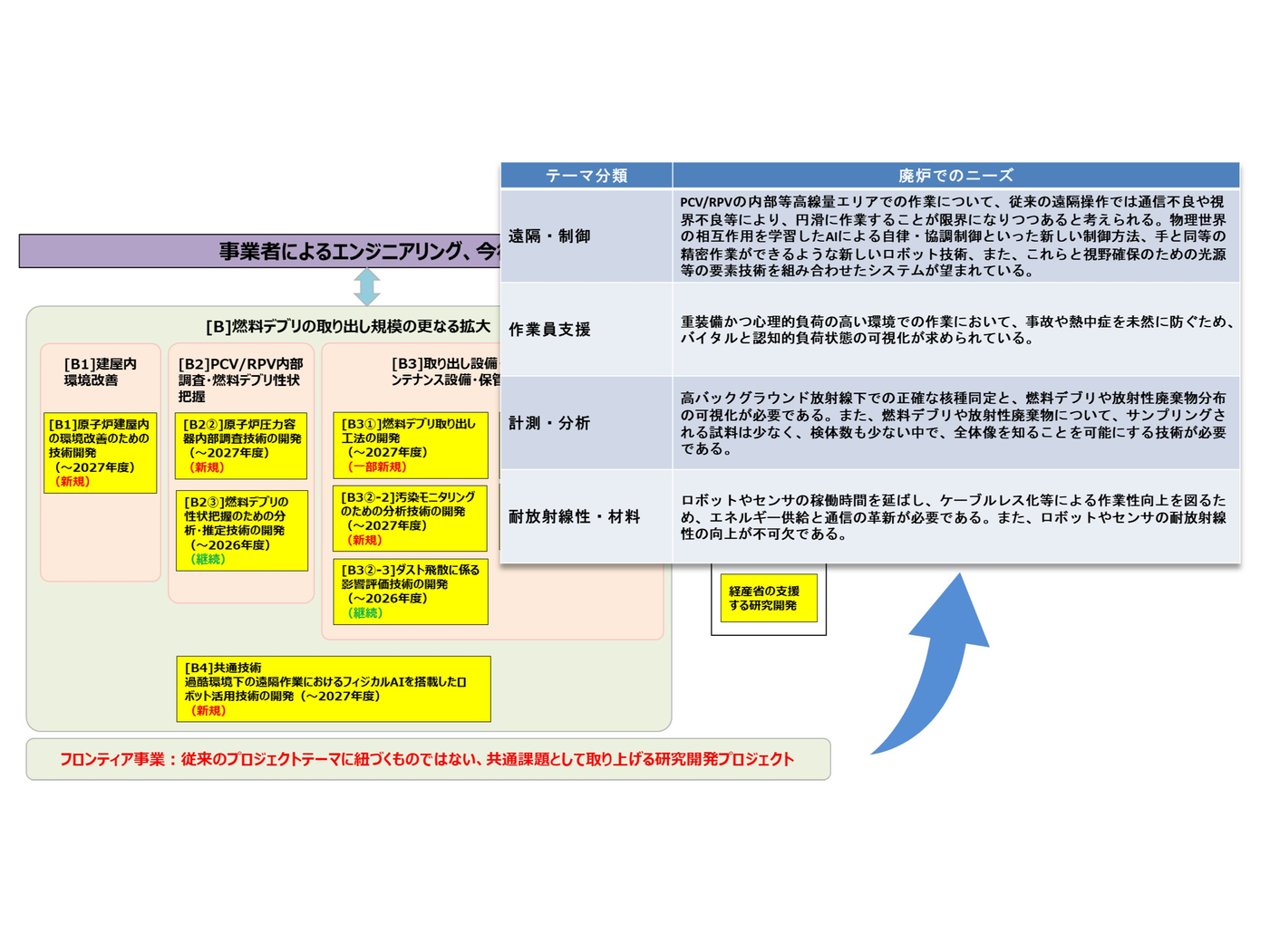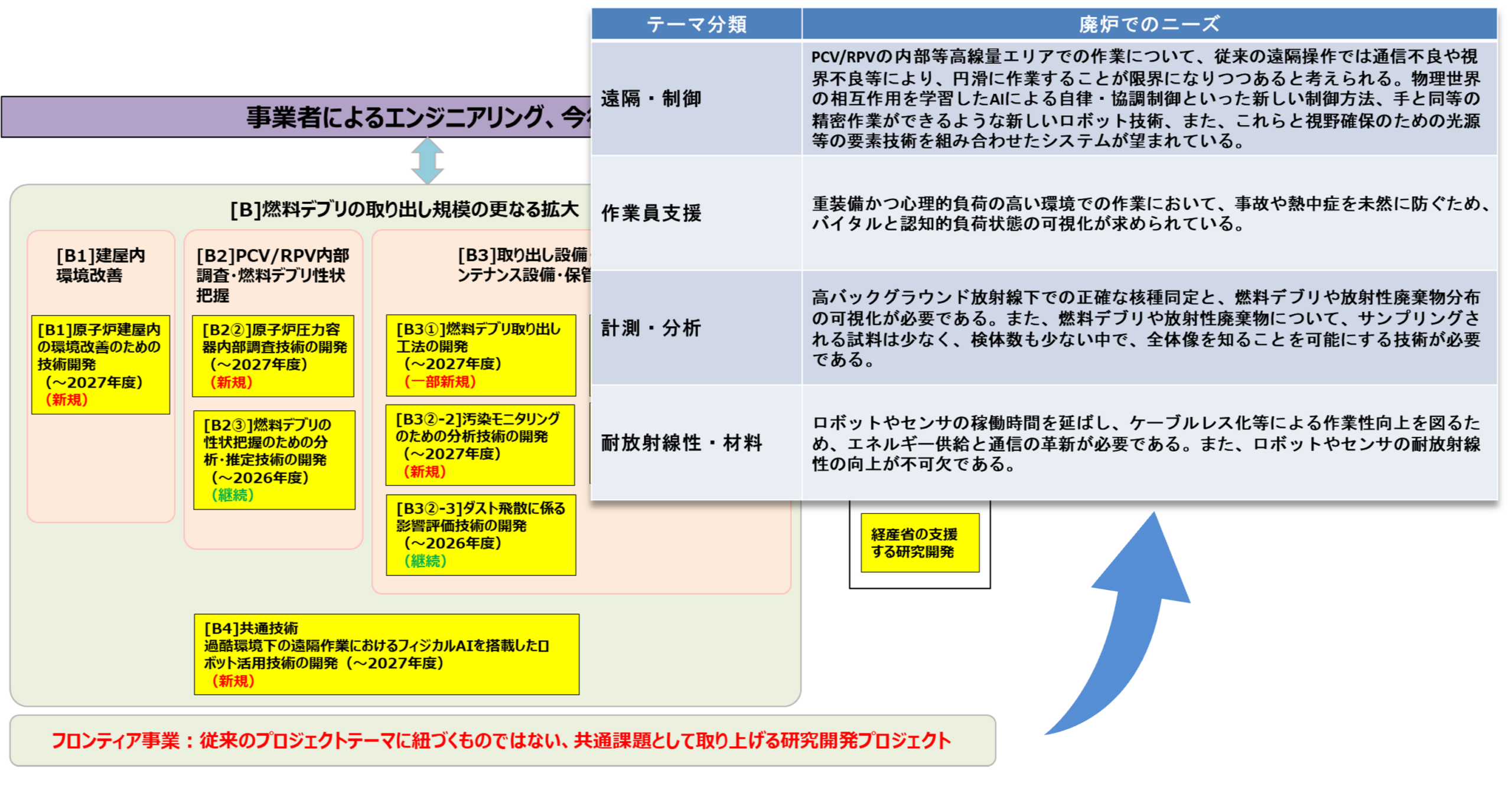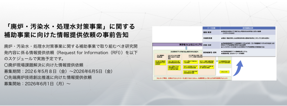 新着情報 一覧へ 新着 2026.04.17 令和8年度開始「廃炉・汚染水・処理水対策事業」に関する補助事業の公募(第三次)のご案内【2026年4月17日掲載】 2026.04.03 令和8年度開始「廃炉・汚染水・処理水対策事業費補助金」に係る補助事業(第一次)の採択結果【2026年4月3日掲載】 2026.03.23 令和8年度開始「廃炉・汚染水・処理水対策事業」に関する補助事業の公募(第二次)のご案内【2026年3月23日掲載、2026年4月14日更新】 2026.03.11 【電中研】令和5年度開始「廃炉・汚染水・処理水対策事業」に関する補助事業(第一次公募、安全システム(ダスト飛散率データ取得))の成果の概要【2026年3月11日掲載】 2026.02.27 令和8年度開始「廃炉・汚染水・処理水対策事業」に関する補助事業の公募(第一次)のご案内【2026年2月27日掲載、2026年3月17日更新】 公募情報 2026.04.17 令和8年度開始「廃炉・汚染水・処理水対策事業」に関する補助事業の公募(第三次)のご案内【2026年4月17日掲載】 2026.03.23 令和8年度開始「廃炉・汚染水・処理水対策事業」に関する補助事業の公募(第二次)のご案内【2026年3月23日掲載、2026年4月14日更新】 2026.02.27 令和8年度開始「廃炉・汚染水・処理水対策事業」に関する補助事業の公募(第一次)のご案内【2026年2月27日掲載、2026年3月17日更新】 2025.04.07 令和7年度開始「廃炉・汚染水・処理水対策事業」に関する補助事業の公募(第三次)のご案内【2025年4月7日掲載、2025年4月24日更新】 2025.03.24 令和7年度開始「廃炉・汚染水・処理水対策事業」に関する補助事業の公募(第二次)のご案内【2025年3月24日掲載、2025年4月16日更新】 採択情報 2026.04.03 令和8年度開始「廃炉・汚染水・処理水対策事業費補助金」に係る補助事業(第一次)の採択結果【2026年4月3日掲載】 2025.06.05 令和7年度開始「廃炉・汚染水・処理水対策事業費補助金」に係る補助事業(第三次)の採択結果【2025年6月5日掲載】 2025.05.23 令和7年度開始「廃炉・汚染水・処理水対策事業費補助金」に係る補助事業(第二次)の採択結果【2025年5月23日掲載】 2025.03.31 令和7年度開始「廃炉・汚染水・処理水対策事業費補助金」に係る補助事業(第一次)の採択結果【2025年3月31日掲載】 2024.07.10 令和6年度開始「廃炉・汚染水・処理水対策事業費補助金」に係る補助事業(第二次)の採択結果【2024年7月10日掲載】 事業成果 2026.03.11 【電中研】令和5年度開始「廃炉・汚染水・処理水対策事業」に関する補助事業(第一次公募、安全システム(ダスト飛散率データ取得))の成果の概要【2026年3月11日掲載】 2026.01.30 【電中研】令和5年度開始「廃炉・汚染水・処理水対策事業」に関する補助事業(第一次公募、固体廃棄物の処理・処分に関する研究開発(スラリーの低温固化処理に関する研究開発))の成果の概要【2026年1月30日掲載】 2025.11.27 【JAEA】令和5年度開始「廃炉・汚染水・処理水対策事業」に関する補助事業(第一次公募、原子炉建屋内の環境改善のための技術開発(被ばく低減のための環境・線源分布のデジタル化技術の高機能化開発))の成果の概要【2025年11月27日掲載】 2025.10.31 【Decom.Tech】令和5年度開始「廃炉・汚染水・処理水対策事業」に関する補助事業(第四次公募、燃料デブリ取り出し工法の開発(気中上取り出し工法における大型搬送装置等のオペフロ上部設備の開発))の成果の概要【2025年10月31日掲載】 2025.10.30 【JAEA】令和5年度開始「廃炉・汚染水・処理水対策事業」に関する補助事業(第一次公募、燃料デブリの性状把握のための分析・推定技術の開発)の成果の概要【2025年10月30日掲載】 事務局/補助事業者からの公募公告 2026.01.30 【応募期限:2026年2月19日】【事務局】「令和5年度、令和6年度及び令和7年度開始廃炉・汚染水・処理水対策事業検査業務支援(令和8年度その1)」に係る競争入札公告について【2026年1月30日掲載(公募終了)】 2026.01.30 【応募期限:2026年2月19日】【事務局】「廃炉・汚染水・処理水対策事業事務局業務支援(令和8年度)」に係る競争入札公告について【2026年1月30日掲載(公募終了)】 2025.09.05 【応募期限:2025年9月25日】【事務局】「令和5年度、令和6年度及び令和7年度開始廃炉・汚染水・処理水対策事業検査業務支援(令和7年度その2)」に係る競争入札公告について【2025年9月5日掲載(公募終了)】 2025.02.12 【応募期限:2025年2月25日】【事務局】「令和5年度及び令和6年度開始廃炉・汚染水・処理水対策事業検査業務支援(令和7年度その1)」に係る競争入札公告について【2025年2月12日掲載(公募終了)】 2025.02.12 【応募期限:2025年2月25日】【事務局】「廃炉・汚染水・処理水対策事業事務局業務支援(令和7年度)」に係る競争入札公告について【2025年2月12日掲載(公募終了)】 事業一覧 一覧へ 内部調査 取り出し工法の開発 作業環境の向上 廃棄物処理等 汚染水対策 使用済燃料保管 リンク集 一覧へ 関連サイト 経済産業省 廃炉・汚染水・処理水対策ポータルサイト 東京電力 福島第一廃炉推進カンパニー NDF 廃炉支援部門 技術研究組合 国際廃炉研究開発機構 JAEA 福島研究開発部門 廃炉・汚染水対策に関連する取組み