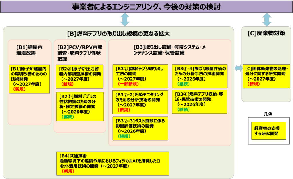 廃炉・汚染水・処理水対策事業事務局では、福島第一原発の廃炉に向け、廃炉現場における課題へと対応するため、図1に示す研究開発計画の一覧に沿って研究開発を実施しています。この研究開発一覧の各プロジェクトテーマに沿った形で、現場課題解決に資する研究開発課題・実施内容・技術に関する情報提供依頼を実施します。