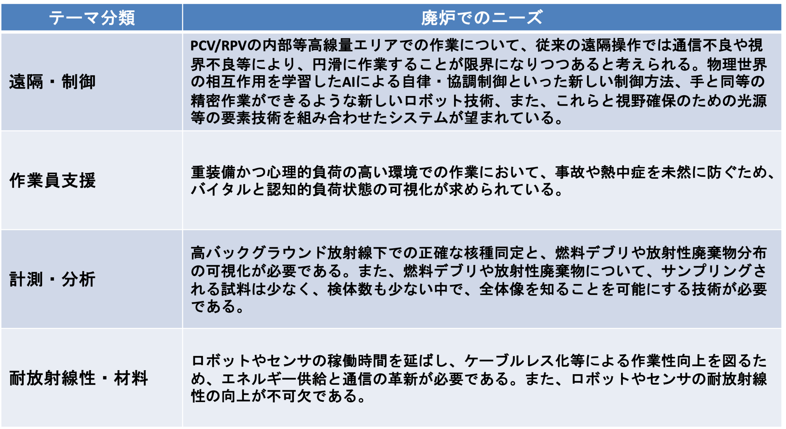 福島第一原発の廃炉は、世界にも例のない技術的難易度の高い現場であり、将来直面しうる未知の技術課題への対応が求められます。そのため、従来の課題・テーマ主導型の研究開発に加え、先端技術や他分野における既存技術を柔軟に取り込み、廃炉現場における新たな活用可能性を見出すアプローチが不可欠です。特定の課題設定・テーマにとらわれず、福島第一原発の廃炉現場作業に適用可能な共通技術について、幅広く知見・提案を募集する目的から、情報提供依頼を実施します。事務局にて想定している取り組むべき研究開発のニーズを図2に示します。