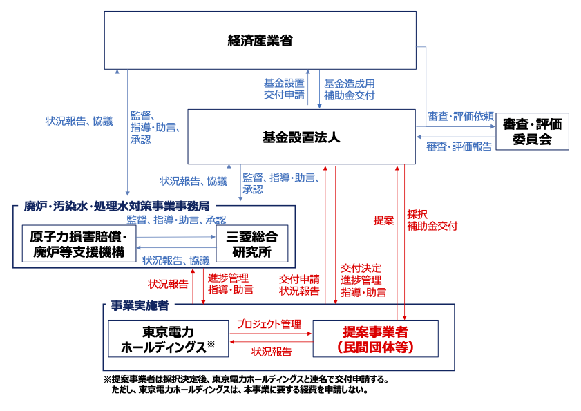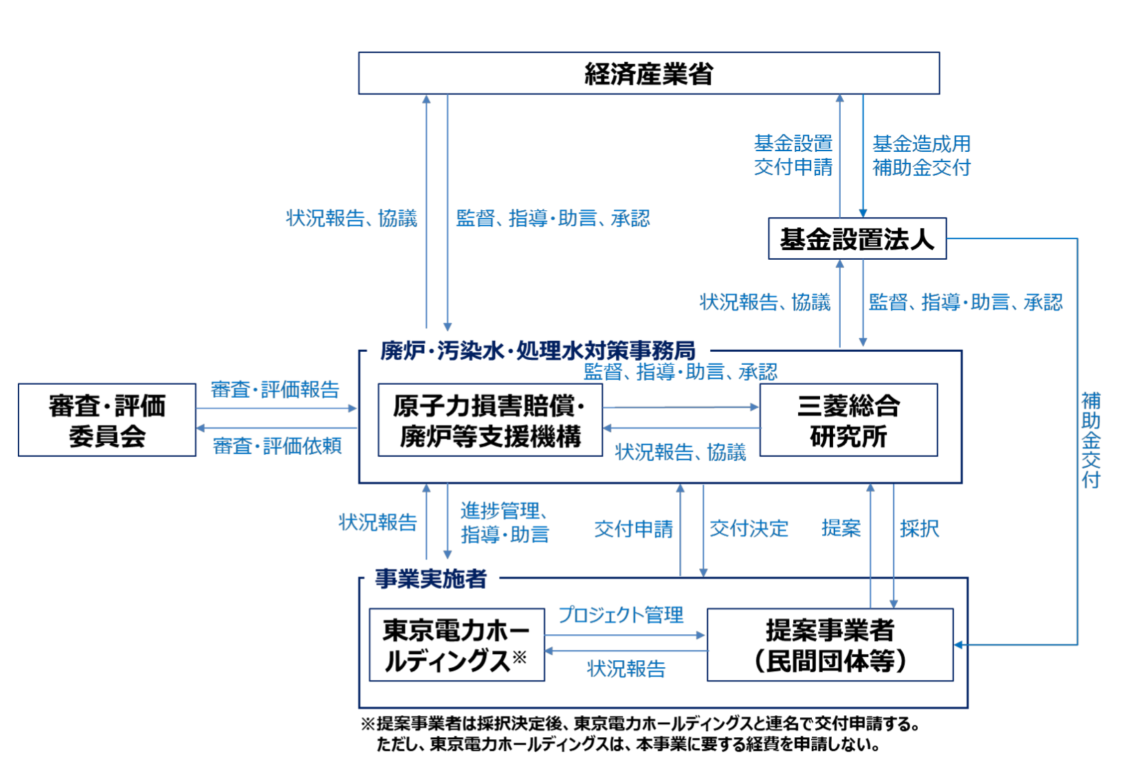 廃炉・汚染水・処理水対策事業事務局は、補助事業者の公募、第三者委員会による審査及び採択に関する手続き、補助事業者による事業の進捗管理、指導・助言、確定検査、支払い手続き及び事業に関する問合せ対応等の業務を行っています。